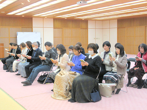 配信に先立ち、房本喜久美・白鳩会連合会長及び長部彰弘・相愛会連合会長から開会の挨拶を頂き、本部の先導に合わせて「観世音菩薩讃歌」の一斉読誦を行いました。