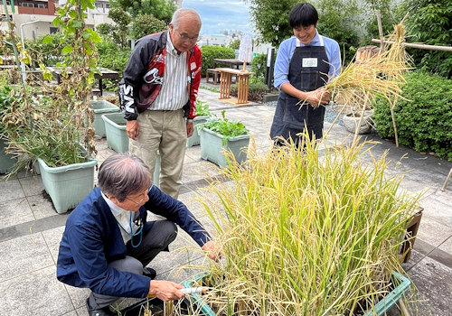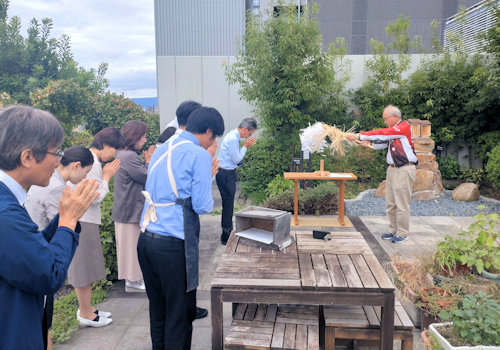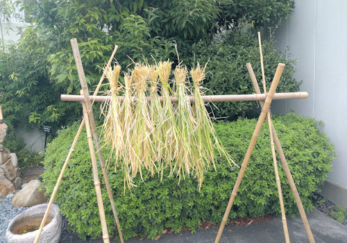 当日は秋晴れで、抜穂祭に相応しい日となりました。 植えられた稲が豊かに実ったことへの感謝と、今後の豊 作を祈念、参加の皆さんと稲刈りをし、稲穂を少量です が、竹で組んだ「稲架(はざ)」に掛ることができました。