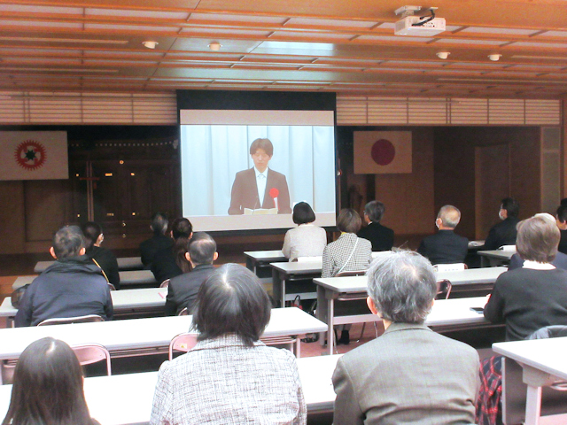 3月11日(水)「神・自然・人間の大調和祈念祭」が“森の中のオフィス”で執り行われ、教化部・中道場のスクリーンで上映されました。式典の中で、俳句入選者の発表があり、木村裕子さんが入選されました。