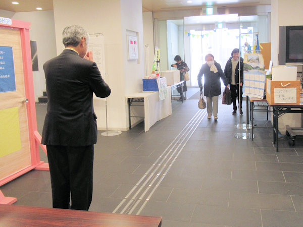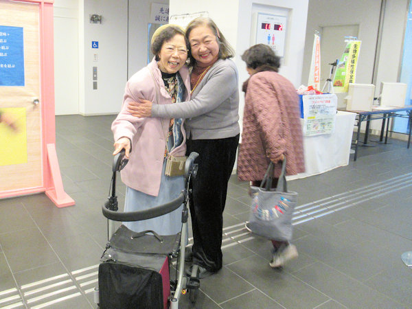 左:入り口で参加者を礼拝する、小田惠造練成主任 右:練成会で再会を喜び合う村上龍子元連合会長